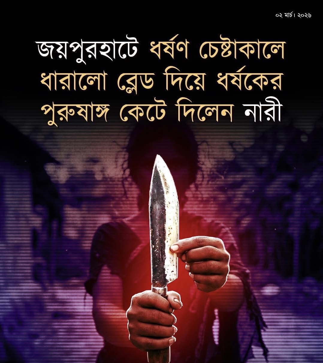 জয়পুরহাটের ক্ষেতলালে এক গৃহবধূকে ধর্ষণচেষ্টার অভিযোগে এক ব্যক্তির পুরুষাঙ্গ কেটে দেওয়ার ঘটনা ঘটেছে। আত্মরক্ষার্থে ধারালো ব্লেড ব্যবহার করে অভিযুক্তের পুরুষাঙ্গ কেটে দিয়েছেন ভুক্তভোগী নারী। রোববার (১ মার্চ) রাত ৭টার পর ক্ষেতলাল পৌর এলাকার মুন্দাইল গ্রামে এ ঘটনা ঘটে।